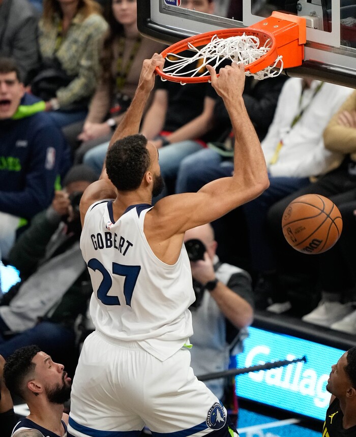 (Francisco Kjolseth | The Salt Lake Tribune) Minnesota Timberwolves center Rudy Gobert (27) dunks as the Utah Jazz take on Minnesota Timberwolves in NBA basketball at Vivint Arena in Salt Lake City on Friday, Dec. 9, 2022.