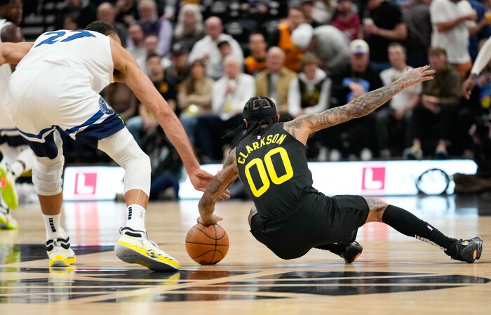 (Francisco Kjolseth | The Salt Lake Tribune) Utah Jazz guard Jordan Clarkson (00) is pressured by Minnesota Timberwolves center Rudy Gobert (27) as the Utah Jazz take on Minnesota Timberwolves in NBA basketball at Vivint Arena in Salt Lake City on Friday, Dec. 9, 2022.