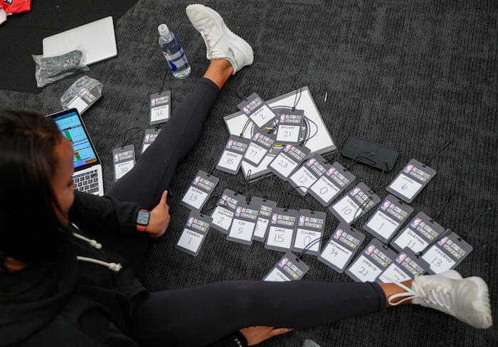 (Francisco Kjolseth | The Salt Lake Tribune) Brittany Beckwith, encore and brand partnerships, prepares name tags for game bags in the Utah Jazz locker room as part of the All-Star weekend on Wednesday, Feb. 15, 2023, for the All-Star weekend.