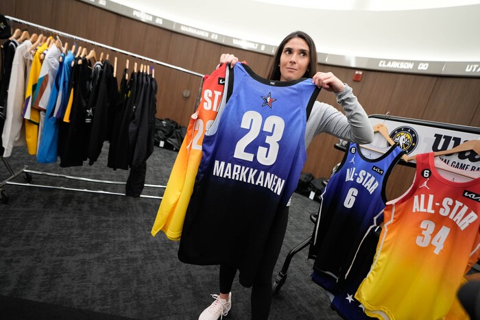 (Francisco Kjolseth | The Salt Lake Tribune) Hallie Keselman, NBA events equipment and team product lead, shows off some of the game jerseys that will be worn by the All-Stars during preparations inside the Utah Jazz locker room at Vivint Arena on Wednesday, Feb. 15, 2023, for the All-Star weekend.
