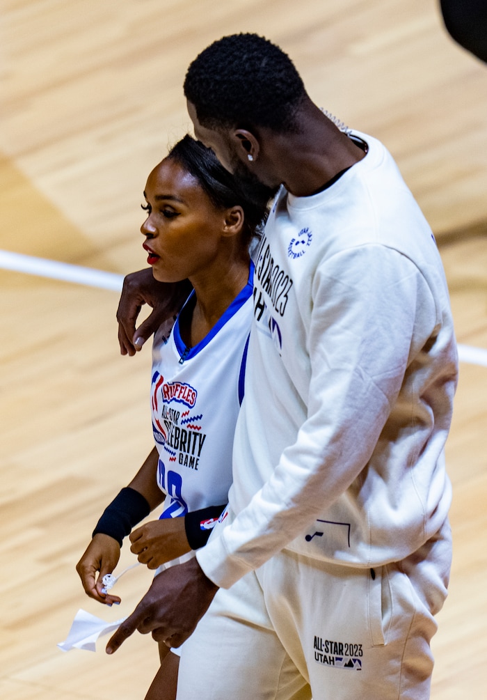 (Rick Egan | The Salt Lake Tribune) Dwyane Wade walks with Janelle Moae, during the NBA All-Star Celebrity Game, at the Jon M. Huntsman Center, on Friday, Feb. 17, 2023.