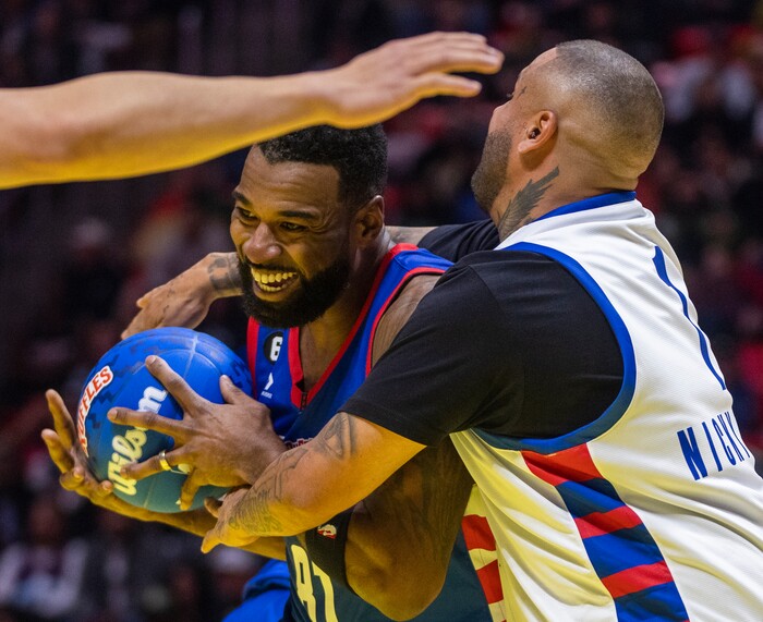 (Rick Egan | The Salt Lake Tribune) Calvin "Megatron" Johnson is tied up by Nicky Jam, during the NBA All-Star Celebrity Game, at the Jon M. Huntsman Center, on Friday, Feb. 17, 2023.