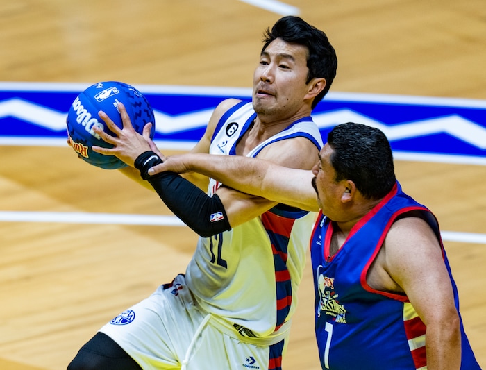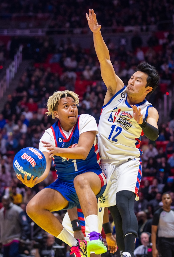 (Rick Egan | The Salt Lake Tribune) Simu Liu goes to the hoop, as Guillermo Rodriguez defends, during the NBA All-Star Celebrity Game, at the Jon M. Huntsman Center, on Friday, Feb. 17, 2023.
