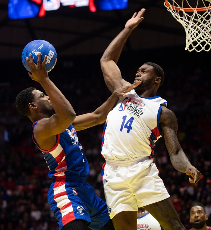 (Rick Egan | The Salt Lake Tribune) DK Everett Osbourne has his shot blocked by DK Metcalf, during the NBA All-Star Celebrity Game, at the Jon M. Huntsman Center, on Friday, Feb. 17, 2023.