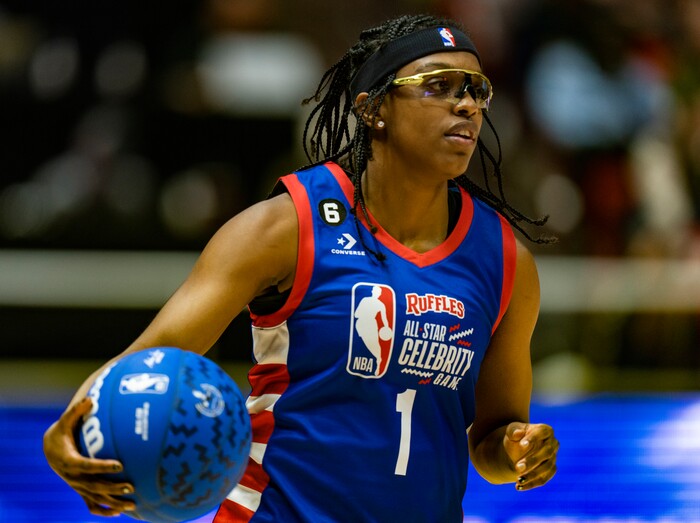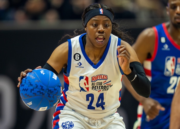 (Rick Egan | The Salt Lake Tribune) Arike Ogunbowale brings the ball down court, during the NBA All-Star Celebrity Game, at the Jon M. Huntsman Center, on Friday, Feb. 17, 2023.