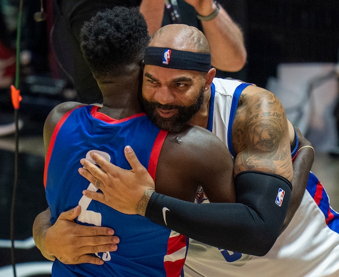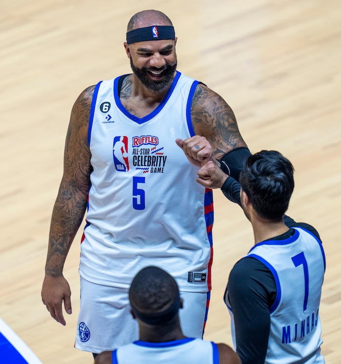 (Rick Egan | The Salt Lake Tribune) Carlos Boozer fist buys Hasan Minhaj, during the NBA All-Star Celebrity Game, at the Jon M. Huntsman Center, on Friday, Feb. 17, 2023.