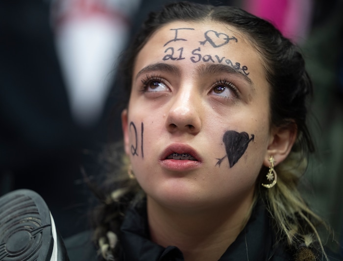 (Rick Egan | The Salt Lake Tribune) A fan of 21 Savage watches him on the video screen hoping to get an autograph during the NBA All-Star Celebrity Game, at the Jon M. Huntsman Center, on Friday, Feb. 17, 2023.