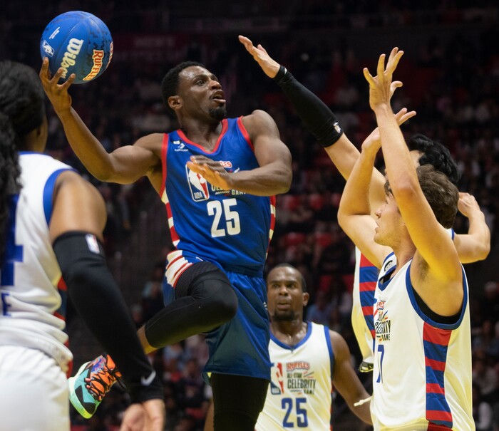 (Rick Egan | The Salt Lake Tribune) EverettmOsbourne goes up for a shot, during the NBA All-Star Celebrity Game, at the Jon M. Huntsman Center, on Friday, Feb. 17, 2023.