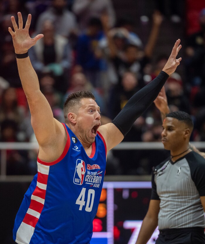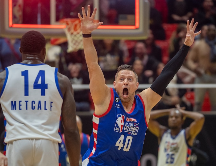 (Rick Egan | The Salt Lake Tribune) The Miz (40) celebrates his 3-point shot at the buzzer, in the NBA All-Star Celebrity Game, at the Jon M. Huntsman Center, on Friday, Feb. 17, 2023. Unfortunately, the basket was ruled no good.