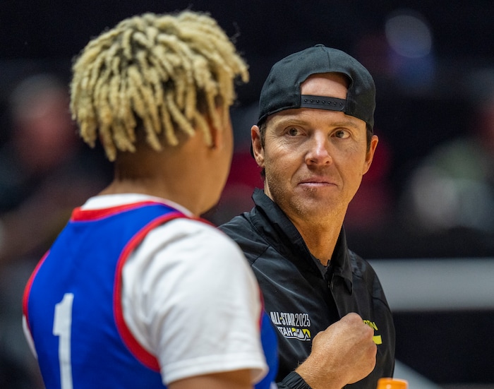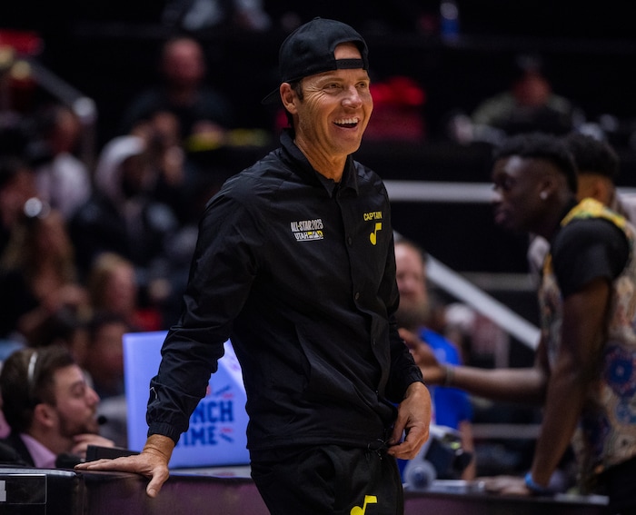 (Rick Egan | The Salt Lake Tribune) Coach Ryan Smith smiles as the coaches his team, during the NBA All-Star Celebrity Game, at the Jon M. Huntsman Center, on Friday, Feb. 17, 2023.