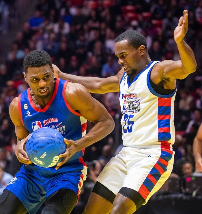 (Rick Egan | The Salt Lake Tribune) DK Everett Osbourne takes the ball to Alex Toussaint, during the NBA All-Star Celebrity Game, at the Jon M. Huntsman Center, on Friday, Feb. 17, 2023.