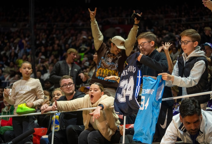 (Rick Egan | The Salt Lake Tribune) Fans wait for autographs, during the NBA All-Star Celebrity Game, at the Jon M. Huntsman Center, on Friday, Feb. 17, 2023.