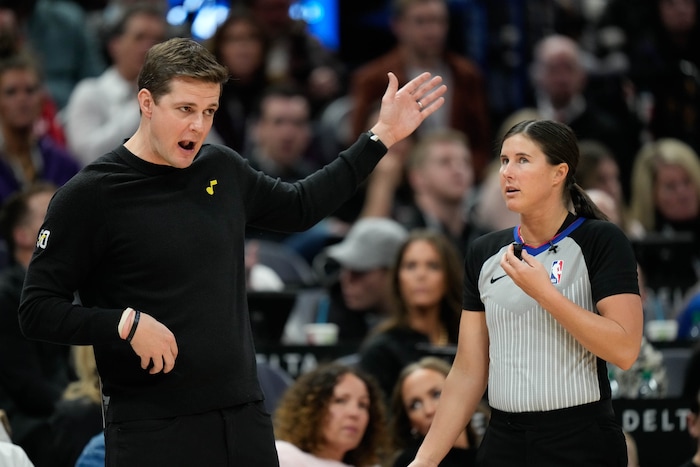 (Francisco Kjolseth | The Salt Lake Tribune) Utah Jazz coach Will Hardy argues with referee Natalie Sago (9) during an NBA basketball game against the Lakers Wednesday, Feb. 14, 2024, in Salt Lake City.