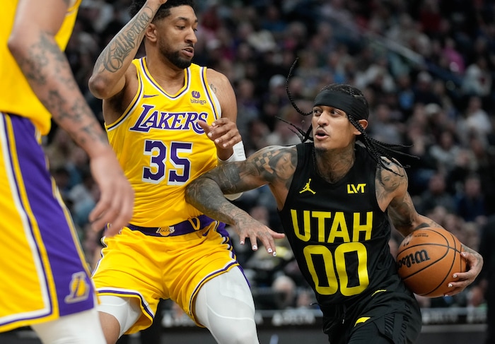 (Francisco Kjolseth | The Salt Lake Tribune) Los Angeles Lakers forward Christian Wood (35) defends against Utah Jazz guard Jordan Clarkson (00) during an NBA basketball game Wednesday, Feb. 14, 2024, in Salt Lake City.