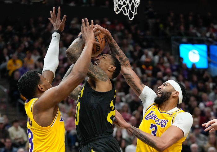 (Francisco Kjolseth | The Salt Lake Tribune) Utah Jazz forward John Collins (20) is blocked by Los Angeles Lakers forward Rui Hachimura (28) and Los Angeles Lakers forward Anthony Davis (3) during an NBA basketball game Wednesday, Feb. 14, 2024, in Salt Lake City.