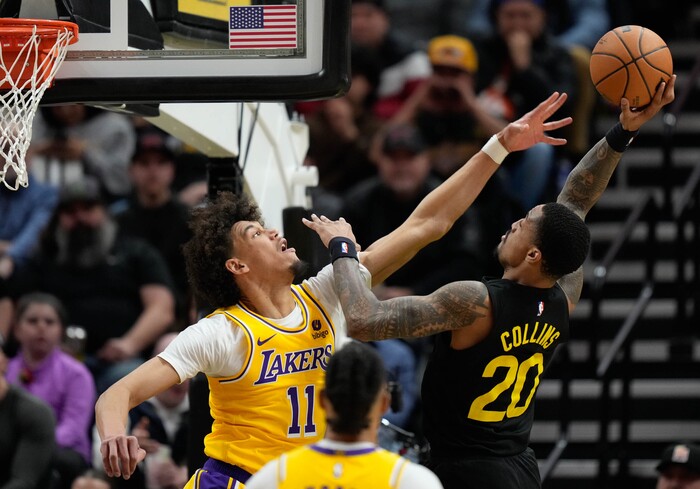 (Francisco Kjolseth | The Salt Lake Tribune) Los Angeles Lakers center Jaxson Hayes (11) reaches for the ball as Utah Jazz forward John Collins (20) tries to make a shot during an NBA basketball game Wednesday, Feb. 14, 2024, in Salt Lake City.