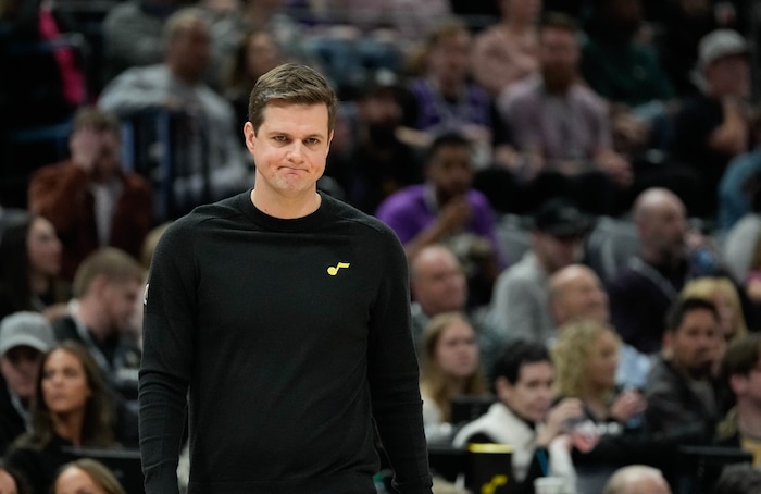(Francisco Kjolseth | The Salt Lake Tribune) Utah Jazz coach Will Hardy shows his disappointment as the team loses 122 - 138 to the Lakers during an NBA basketball game Wednesday, Feb. 14, 2024, in Salt Lake City.