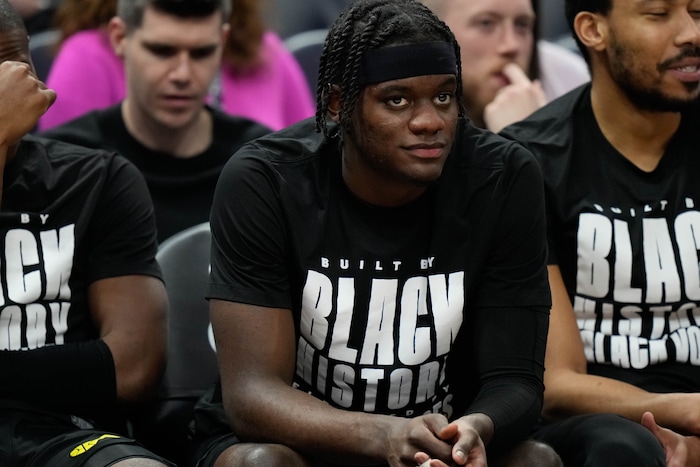 (Francisco Kjolseth | The Salt Lake Tribune) Utah Jazz forward Taylor Hendricks (0) on the bench during an NBA basketball game Wednesday, Feb. 14, 2024, in Salt Lake City.