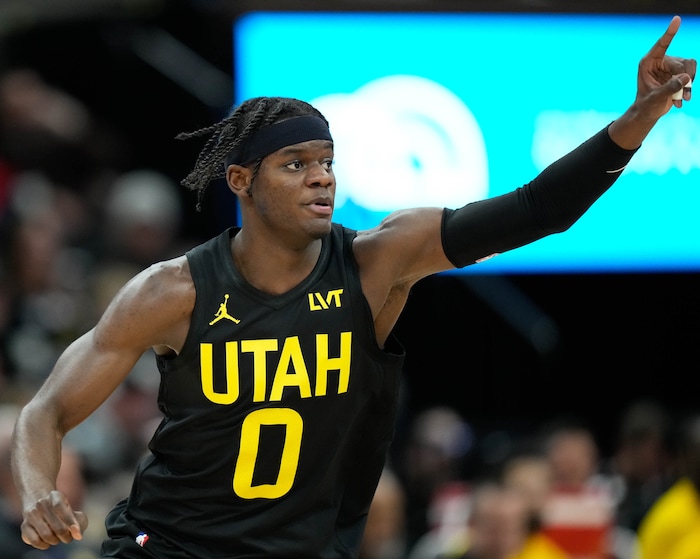 (Francisco Kjolseth | The Salt Lake Tribune) Utah Jazz forward Taylor Hendricks (0) celebrates a shot during an NBA basketball game agains the Lakers Wednesday, Feb. 14, 2024, in Salt Lake City.