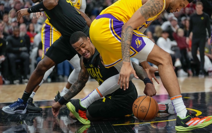 (Francisco Kjolseth | The Salt Lake Tribune) Utah Jazz forward John Collins (20) battles for a ball against the Lakers during an NBA basketball game Wednesday, Feb. 14, 2024, in Salt Lake City.
