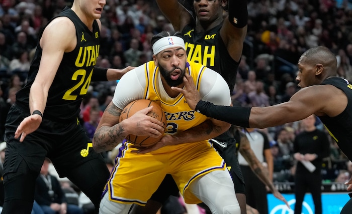 (Francisco Kjolseth | The Salt Lake Tribune) Los Angeles Lakers forward Anthony Davis (3) is heavily defended by the Jazz during an NBA basketball game Wednesday, Feb. 14, 2024, in Salt Lake City.