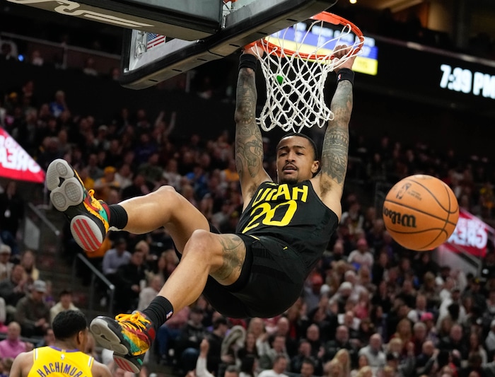(Francisco Kjolseth | The Salt Lake Tribune) Utah Jazz forward John Collins (20) dunks during an NBA basketball game Wednesday, Feb. 14, 2024, in Salt Lake City.