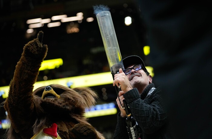 (Francisco Kjolseth | The Salt Lake Tribune) Actor Ty Burrell gets a chance to shoot a t-shirt into the stands with the help of the Jazz Bear during an NBA basketball game against the Lakers on Wednesday, Feb. 14, 2024, in Salt Lake City.