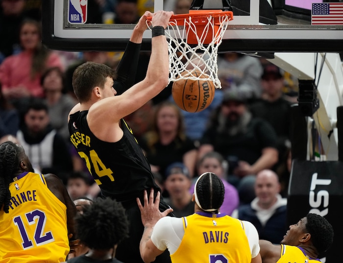 (Francisco Kjolseth | The Salt Lake Tribune) Utah Jazz center Walker Kessler (24) makes a dunk over the Lakers during an NBA basketball game Wednesday, Feb. 14, 2024, in Salt Lake City.
