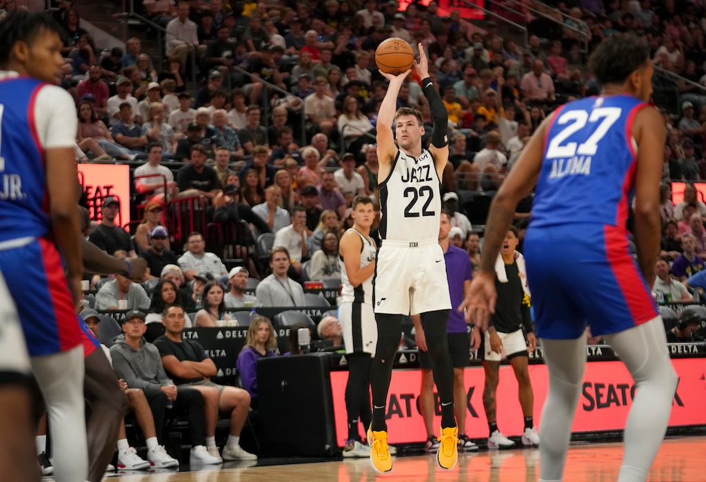 (Utah Jazz) Kyle Filipowski, the No. 32 overall pick in the 2024 NBA Draft, is introduced by the Utah Jazz on July 2.
