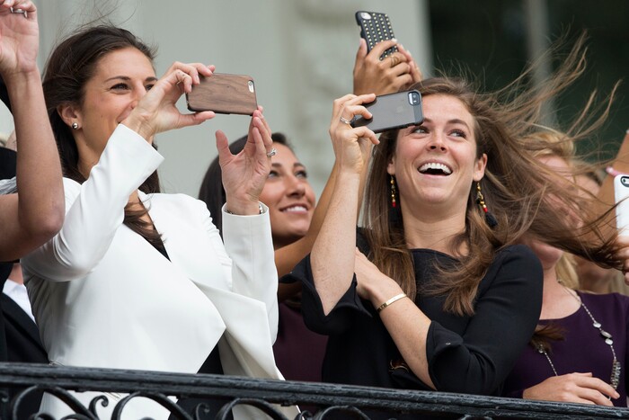 U.S. National Soccer Team members Carli Lloyd, left, and Kelley O'Hara, and others, watch as President Barack leaves the South Lawn of the White House aboard Marine One following a ceremony to honor the 2015 FIFA Women's World Cup champions,Tuesday, Oct. 27, 2015, at the White House in Washington. (AP Photo/Evan Vucci)