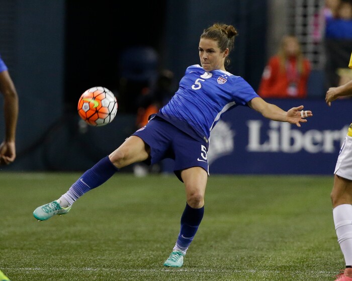 United States' Kelley O'Hara (5) looks on during the second half of an international friendly soccer match against Colombia, Sunday, April 10, 2016, in Chester, PA. US won 3-0. (AP Photo/Chris Szagola)