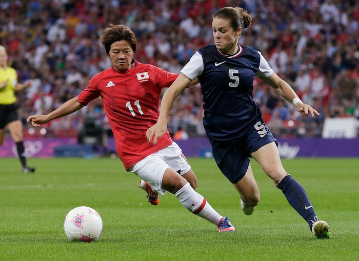 Japan's Shinobu Ohno, left, and United States' Kelley O'Hara, vie for the ball during the women's soccer gold medal match of the at the 2012 Summer Olympics, Thursday, Aug. 9, 2012, in London. The U.S. women's football team won its third straight Olympic gold medal Thursday, beating Japan 2-1 in a rematch of last year's World Cup final and avenging the most painful loss in its history. (AP Photo/Julie Jacobson)