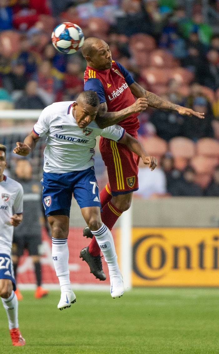 (Rick Egan | The Salt Lake Tribune) FC Dallas midfielder Carlos Gruezo (7) and Real Salt Lake midfielder Everton Luiz (25) go for the ball, in MLS action between Real Salt Lake and FC Dallas, at Rio Tinto Stadium, Saturday, March 30, 2019.