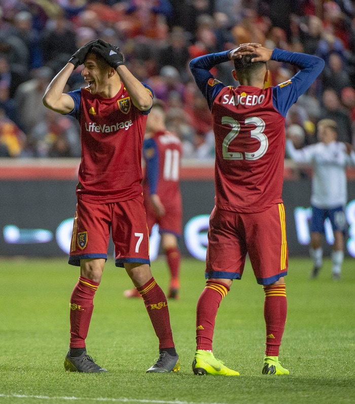 (Rick Egan | The Salt Lake Tribune) FC Real Salt Lake forward Jefferson Savarino (7) and Real Salt Lake midfielder Sebastian Saucedo (23) react after narrowly missing a goal, in MLS action between Real Salt Lake and FC Dallas, at Rio Tinto Stadium, Saturday, March 30, 2019.
