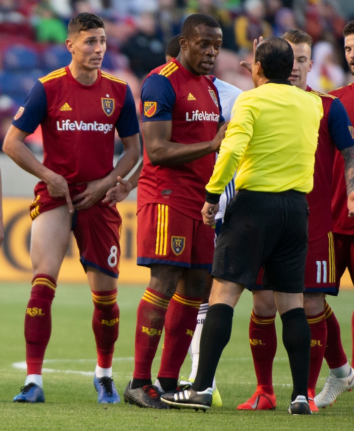 (Rick Egan | The Salt Lake Tribune) Real Salt Lake midfielder Damir Kreilach (8) shows the official his leg after receiving a red card, in MLS action between Real Salt Lake and FC Dallas, at Rio Tinto Stadium, Saturday, March 30, 2019.