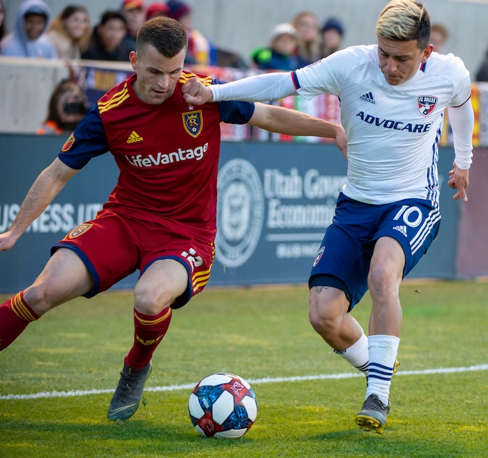 (Rick Egan | The Salt Lake Tribune) Real Salt Lake forward Brooks Lennon (12) goes for the ball along with FC Dallas midfielder Pablo Aranguiz, in MLS action between Real Salt Lake and FC Dallas, at Rio Tinto Stadium, Saturday, March 30, 2019.