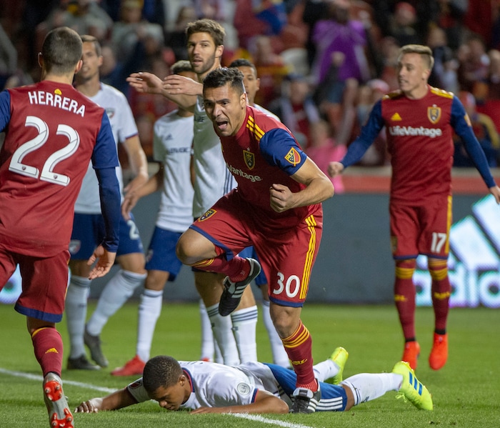 (Rick Egan | The Salt Lake Tribune) Real Salt Lake defender Marcelo Silva (30) reacts after scoring a goal, in MLS action between Real Salt Lake and FC Dallas, at Rio Tinto Stadium, Saturday, March 30, 2019.