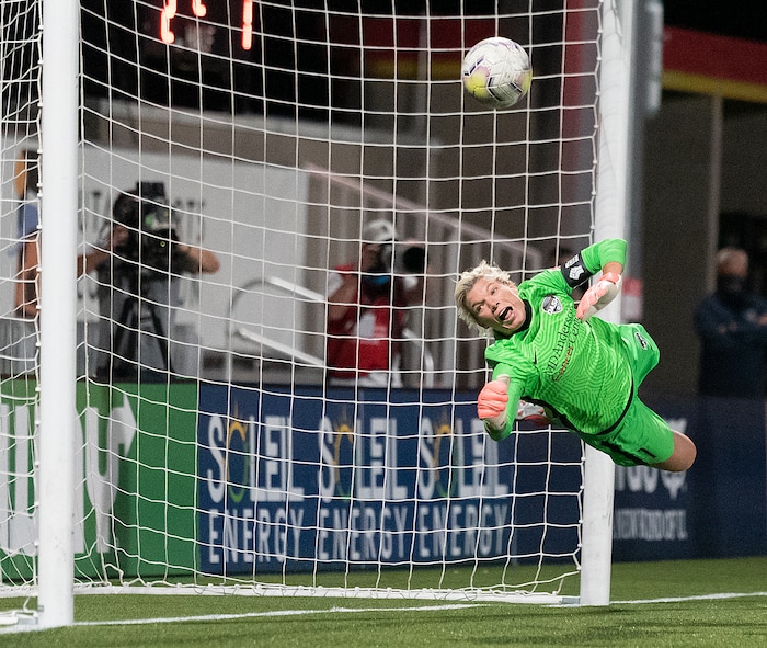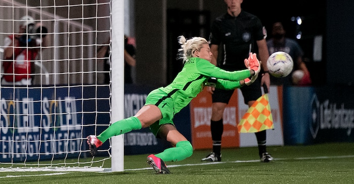 Houston Dash goalkeeeper Jane Campbell (1) makes the game-winning penalty kick save during their match against the Utah Royals FC at Zions Bank Stadium in Herriman, UT on Friday, July 17, 2020.