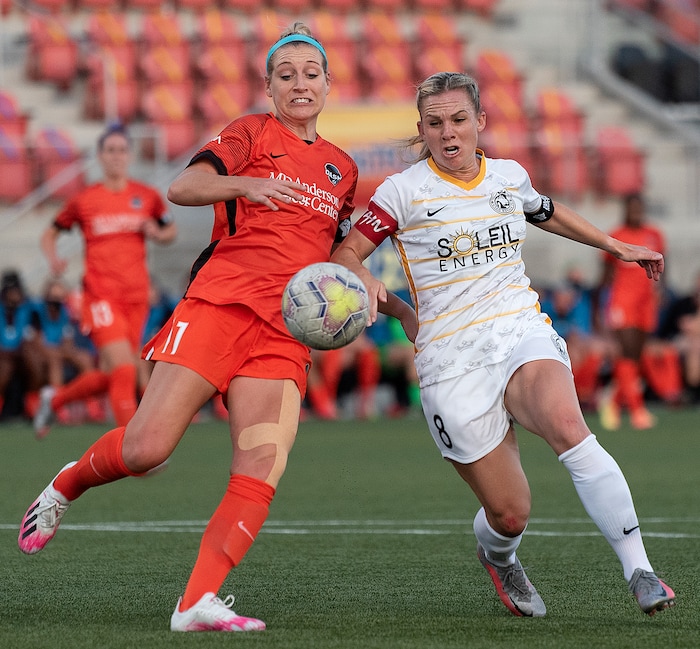 Houston Dash defender Megan Oyster (11), left, and Utah Royals FC forward Amy Rodriguez (8) charge the ball during their match at Zions Bank Stadium in Herriman, UT on Friday, July 17, 2020.