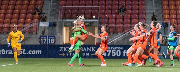 Houston Dash players celebrate their penalty kick shootout victory over the Utah Royals FC as Utah Royals FC goalkeeper Abby Smith (1) jogs off the pitch during their match at Zions Bank Stadium in Herriman, UT on Friday, July 17, 2020.