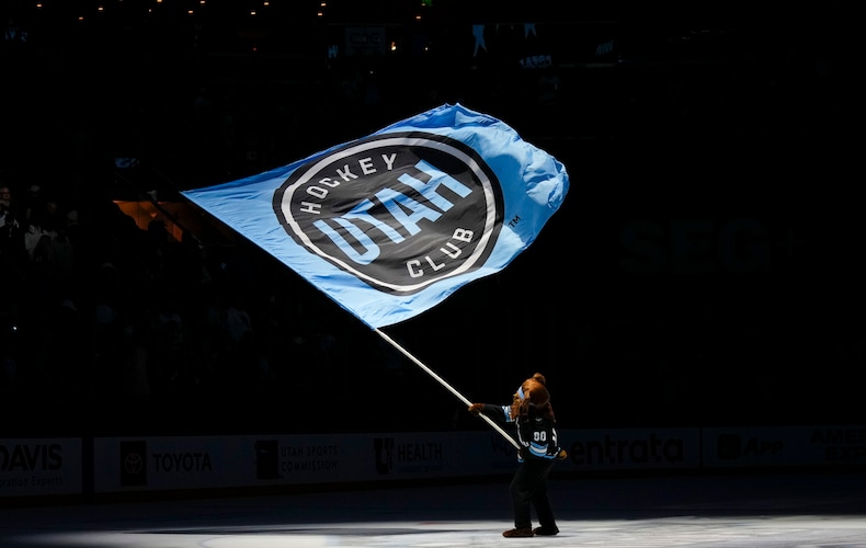 (Bethany Baker | The Salt Lake Tribune) Bear, the mascot for the Utah Hockey Club, waves a flag on the ice after the Utah Hockey Club defeated the Calgary Flames at the Delta Center in Salt Lake City on Tuesday, April 1, 2025.