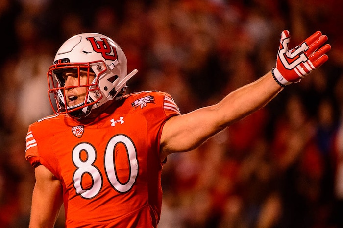 Utah Utes tight end Brant Kuithe (80) signals a first down after a reception as the Utah Utes host the USC Trojans, NCAA football at Rice-Eccles Stadium in Salt Lake City, Saturday Oct. 20, 2018.
