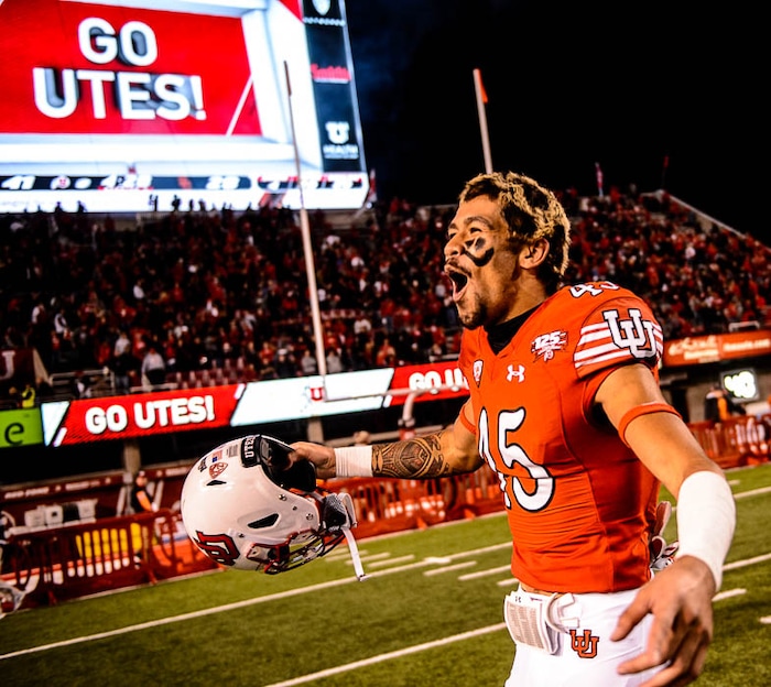 Utah Utes wide receiver Samson Nacua (45) celebrates as the Utah Utes host the USC Trojans, NCAA football at Rice-Eccles Stadium in Salt Lake City, Saturday Oct. 20, 2018.