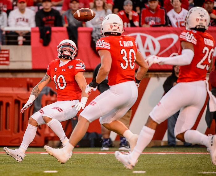 Utah Utes wide receiver Jameson Field (10) looks to down a punt near the end zone as the Utah Utes host the USC Trojans, NCAA football at Rice-Eccles Stadium in Salt Lake City, Saturday Oct. 20, 2018.
