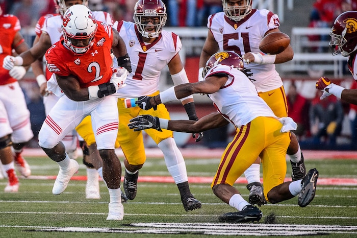 USC Trojans safety Marvell Tell III (7) strips the ball from Utah Utes running back Zack Moss (2) as the Utah Utes host the USC Trojans, NCAA football at Rice-Eccles Stadium in Salt Lake City, Saturday Oct. 20, 2018.