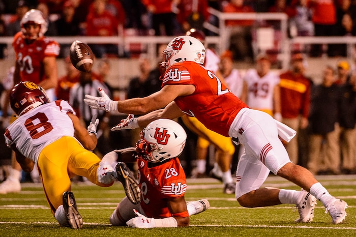 Utah Utes linebacker Chase Hansen (22) fouls USC Trojans wide receiver Velus Jones Jr. (1) as the Utah Utes host the USC Trojans, NCAA football at Rice-Eccles Stadium in Salt Lake City, Saturday Oct. 20, 2018.