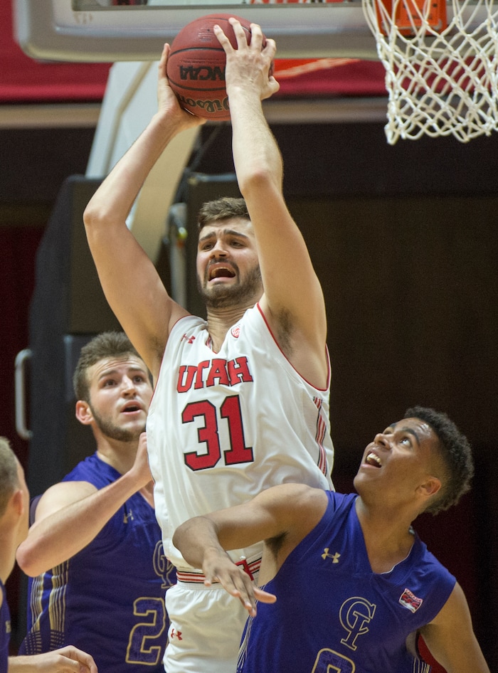 (Rick Egan | The Salt Lake Tribune) Utah Utes center Brandon Morley (31) grabs a rebound for the Utes, in basketball action, between the Utah Utes and the College of Idaho Yotes at the Jon M. Huntsman Center, Thursday, Nov. 1, 2018.