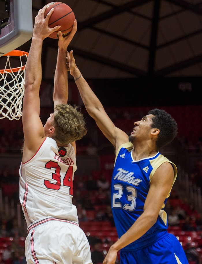 (Rick Egan | The Salt Lake Tribune) Tulsa Golden Hurricane forward Jeriah Horne (41) blocks a sho by Utah Utes center Jayce Johnson (34), in basketball action between, Utah Utes and Tulsa Golden Hurricane, at the Jon M. Huntsman Center, Saturday, Dec. 1, 2018.