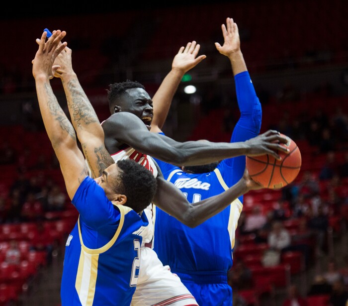 (Rick Egan | The Salt Lake Tribune) Utah Utes center Jayce Johnson (34) tries to get a shot as Tulsa forward Martins Igbanu (1) and Tulsa guard DaQuan Jeffries (2) defend for the Golden Hurricane's, in basketball action between, Utah Utes and Tulsa Golden Hurricane, at the Jon M. Huntsman Center, Saturday, Dec. 1, 2018.