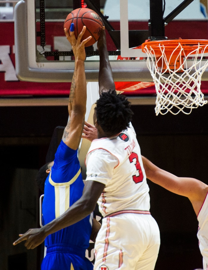 (Rick Egan | The Salt Lake Tribune) Utah Utes forward Donnie Tillman (3) blocks a shot by Tulsa Golden Hurricane guard DaQuan Jeffries (2), in basketball action between, Utah Utes and Tulsa Golden Hurricane, at the Jon M. Huntsman Center, Saturday, Dec. 1, 2018.